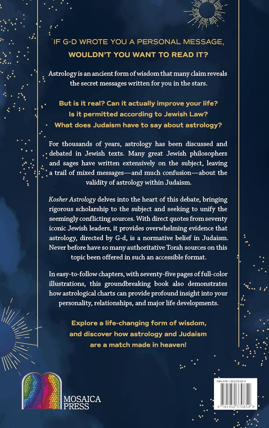 Unlock the ancient wisdom of the cosmos with Kosher Astrology, a comprehensive 500-page guide that shatters common misconceptions about Judaism's stance on astrology. This meticulously researched tome brings rigorous scholarship to the subject, offering direct quotes from seventy iconic Jewish leaders as overwhelming evidence that astrology, directed by God, is a normative belief in Judaism. Never before have so many authoritative Torah sources on this topic been presented in such an accessible format. Explore 75 pages of full-color illustrations that illuminate the celestial wisdom within. Kosher Astrology is a must-have for anyone seeking a deeper understanding of the profound connection between Judaism and the stars.
