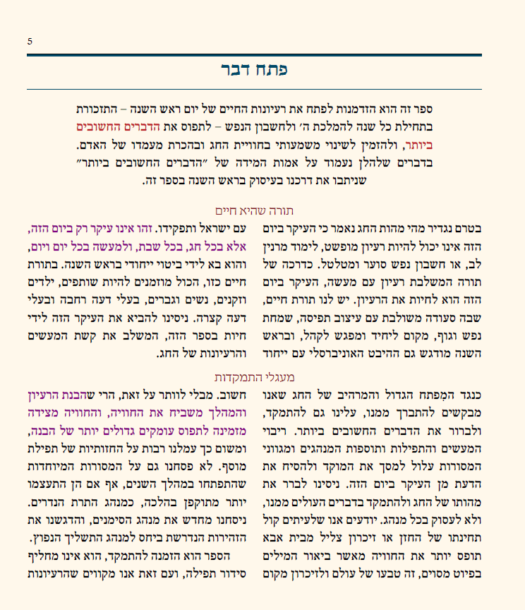ספר זה הוא הזדמנות לפתח את רעיונות החיים של יום ראש השנה – התזכורת בתחילת כל שנה להמלכת ה' ולחשבון הנפש 🗓️ לתפוס את הדברים החשובים ביותר👌, ולהזמין לשינוי משמעותי בחוויית החג 🍯ובהכרת מעמדו של האדם.